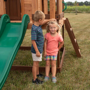 - Elevated Adventure: Raised clubhouse with wrap-around deck adds a new level of fun while accommodating smaller backyards