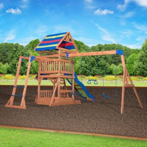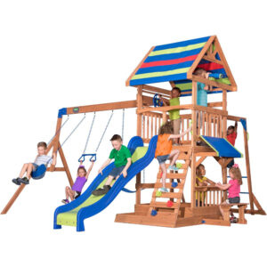 With Northbrook Play Tower large deck and colorful canopy, the upper fort of this swing set creates the perfect imaginative escape – whether your kids are relaxing under a beach umbrella or pretending to sail the high seas in search of pirates with the built-in steering wheel and telescope. The rock wall ladder and monkey bars offer fun and safe climbing options, while the 8-foot slide provides a thrilling, wavy ride back to the ground.
