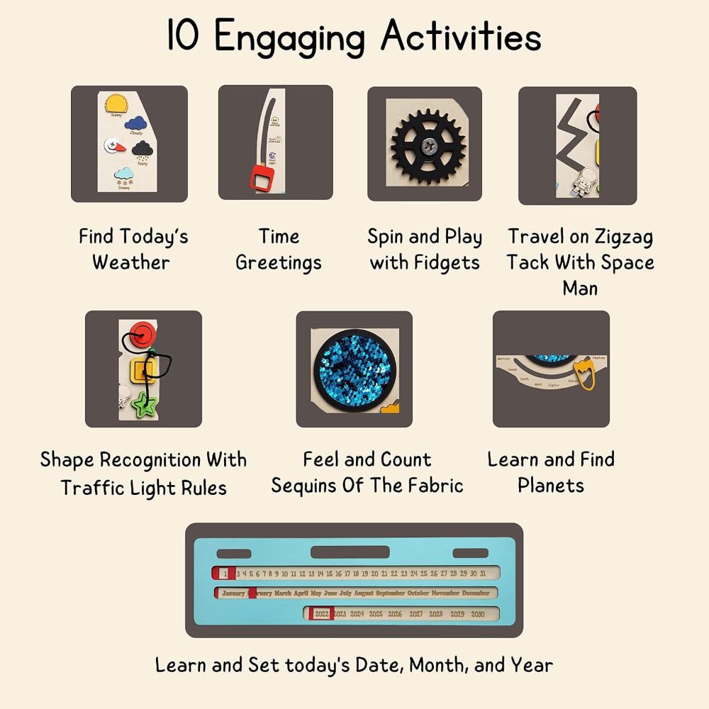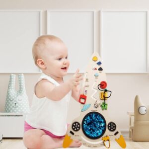 The Busy Board is designed and created by professionals to help the children learn basic life skills while they are playing. It has this is not just a single function boring wooden toy. This Space Settle Busy Board is loaded with interesting and meaningful learning activities. The board is brightly colored and has realistic images of a space shuttle and launch pad.