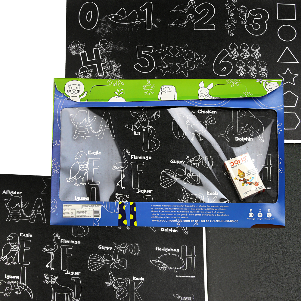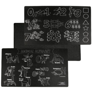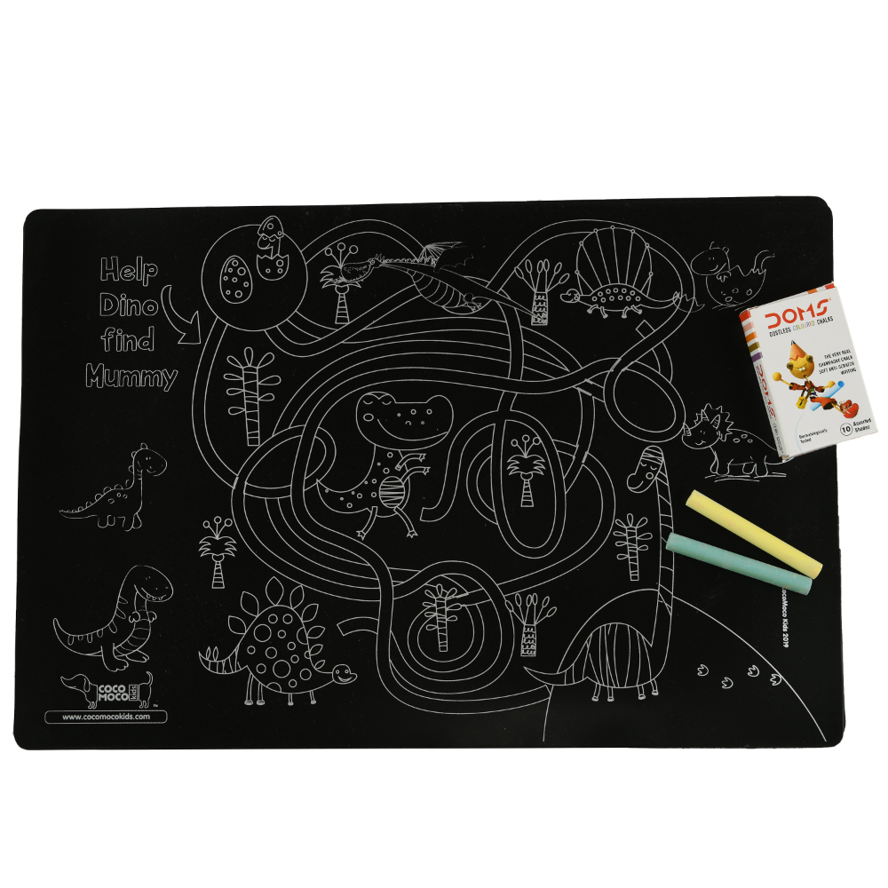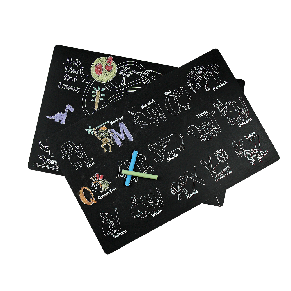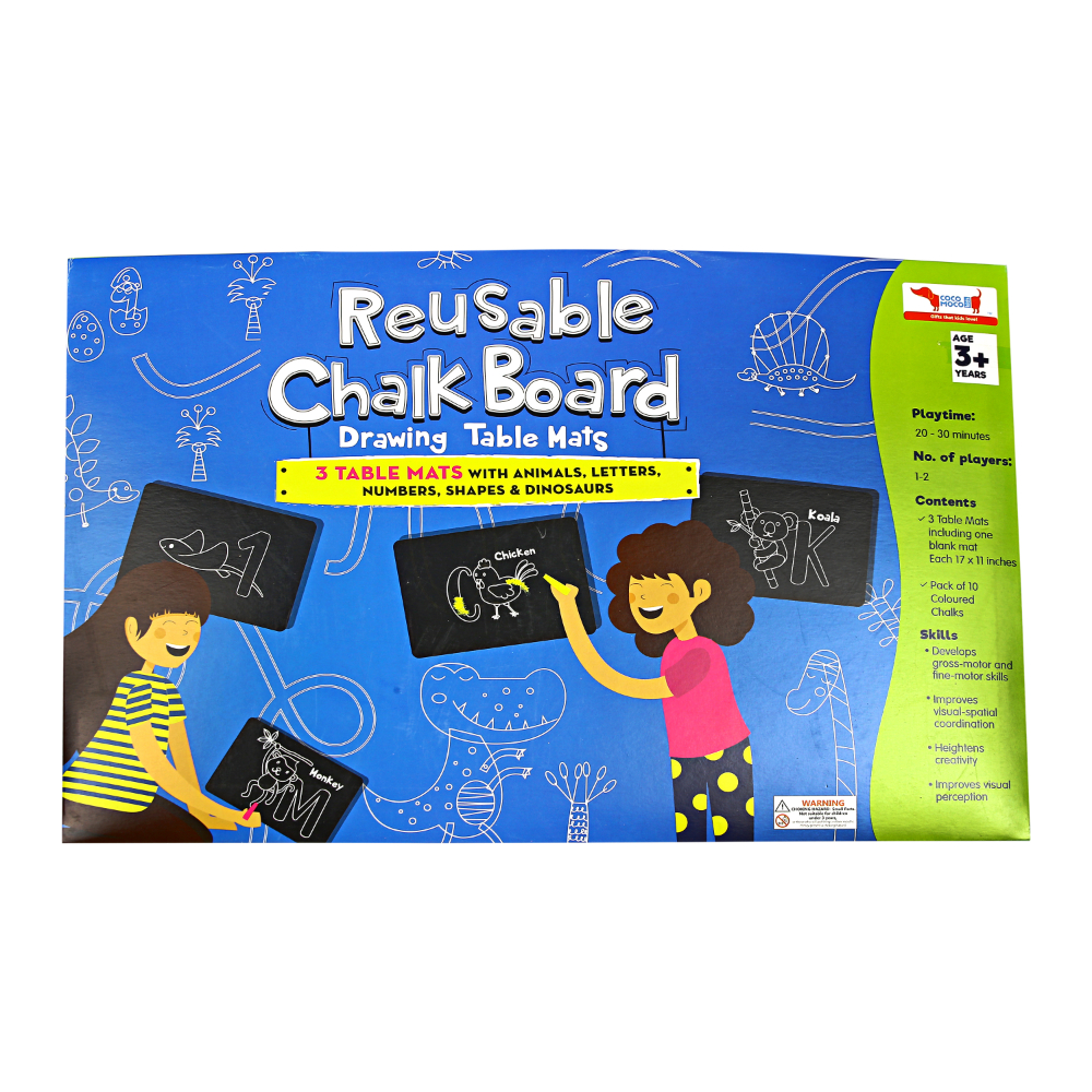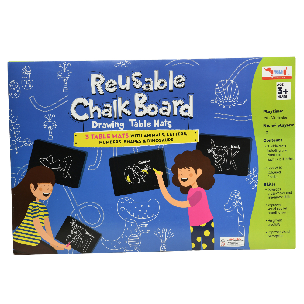 This set of 3 chalk board activity mats is a great way to engage 3-7-year-olds. Each Mat has illustrations on both sides that can be used to play games and colour with chalks.